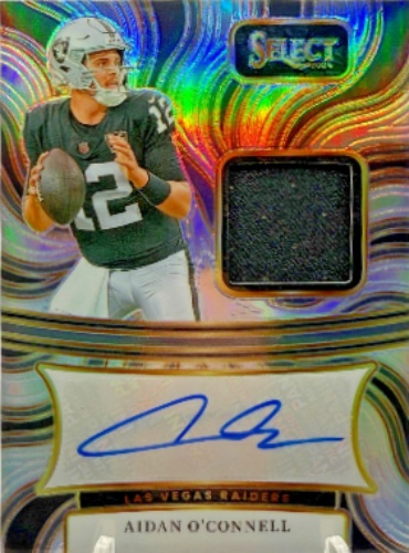 The most expensive item with a signature of Aidan O'Connell (2023 Panini Contenders Optic Rookie Autograph Aidan O'Connell Gold Vinyl 1/1 RC) was sold in November 2025 for $2,800.00 while the cheapest item (2023 Panini Illusions Aidan O'Connell Superlatives Rookie Autograph/50) found a new owner for $2.35 in March 2025. The month with the most items sold (28) was December 2025 with an average selling price of $36.99 for an autographed item of Aidan O'Connell. Sold items reached their highest average selling price in February 2025 with $52.50 and the month that saw the lowest prices with $16.24 was April 2026. In average, an autographed item from Aidan O'Connell is worth $29.99.